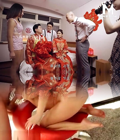 Sweet asian teen gets shared by two lustful guys in bed after the wedding