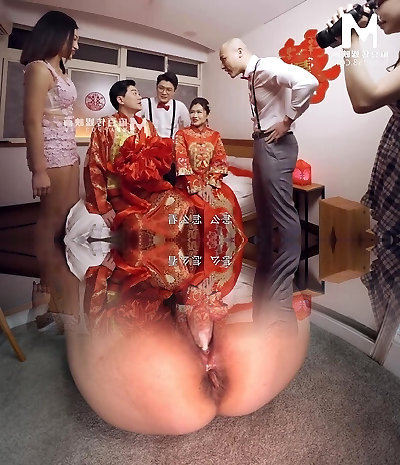 Yummy asian teenage gets shared by two lustful guys in bed after the wedding