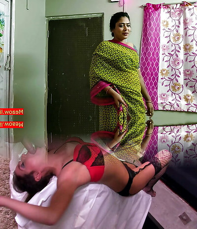 Tamil Cougar Stepmom Stuck Under Bed with white saree & black blouse, when she cleaning under couch then stepson fuck her