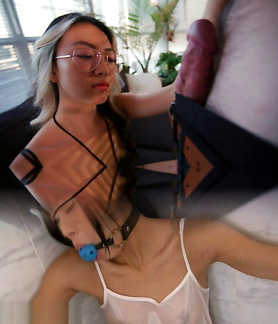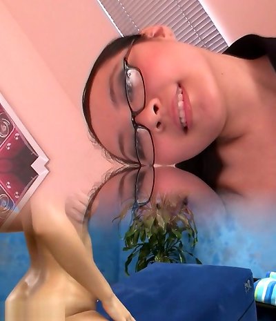 Busty Asian lass with glasses on sucking a highly yam-sized member